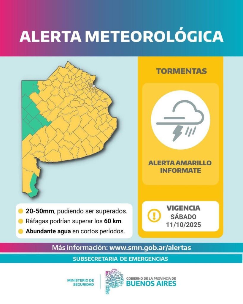 El Servicio Meteorológico Nacional emitió un alerta amarilla por tormentas a partir de la mañana de este sábado.